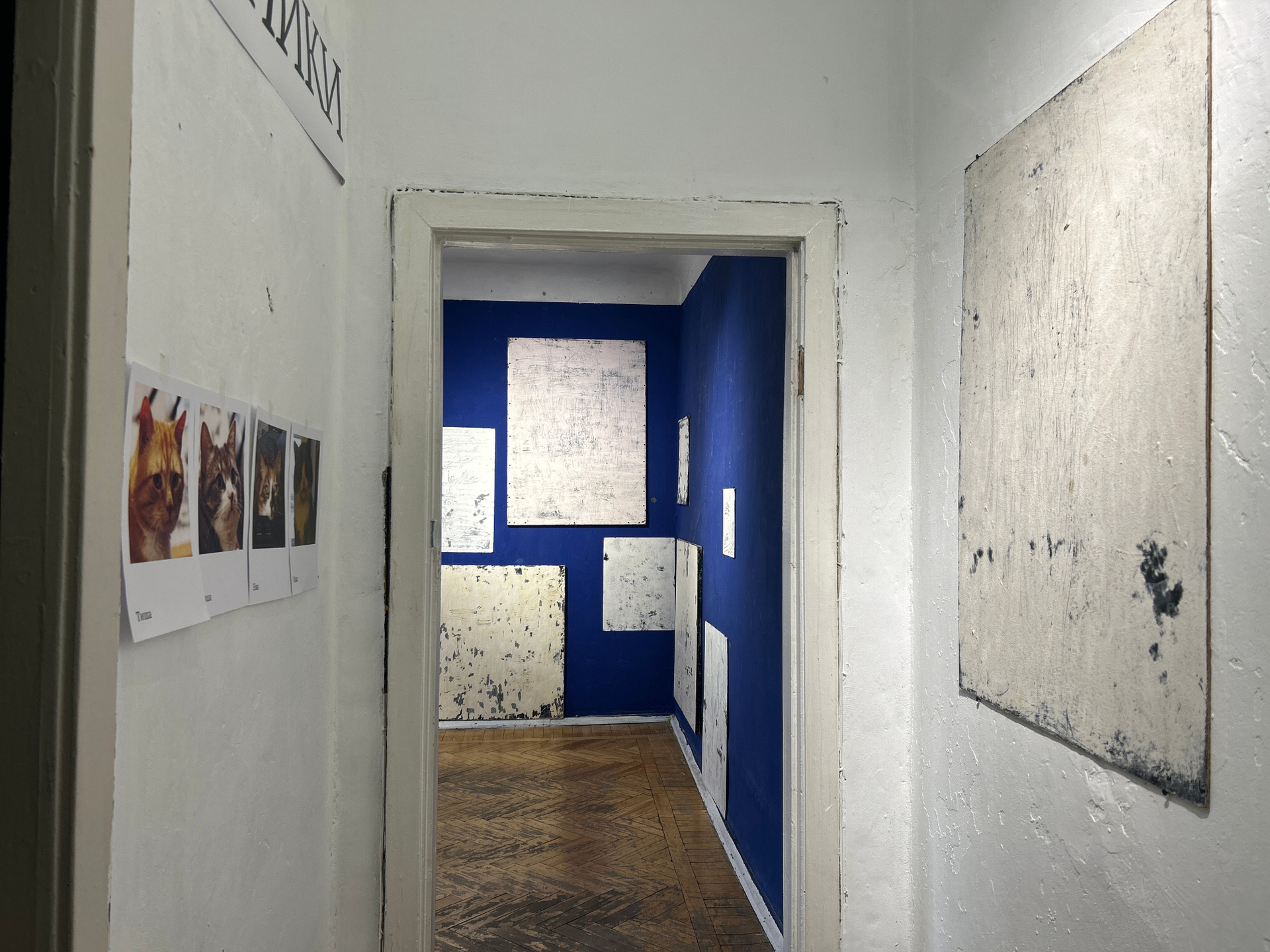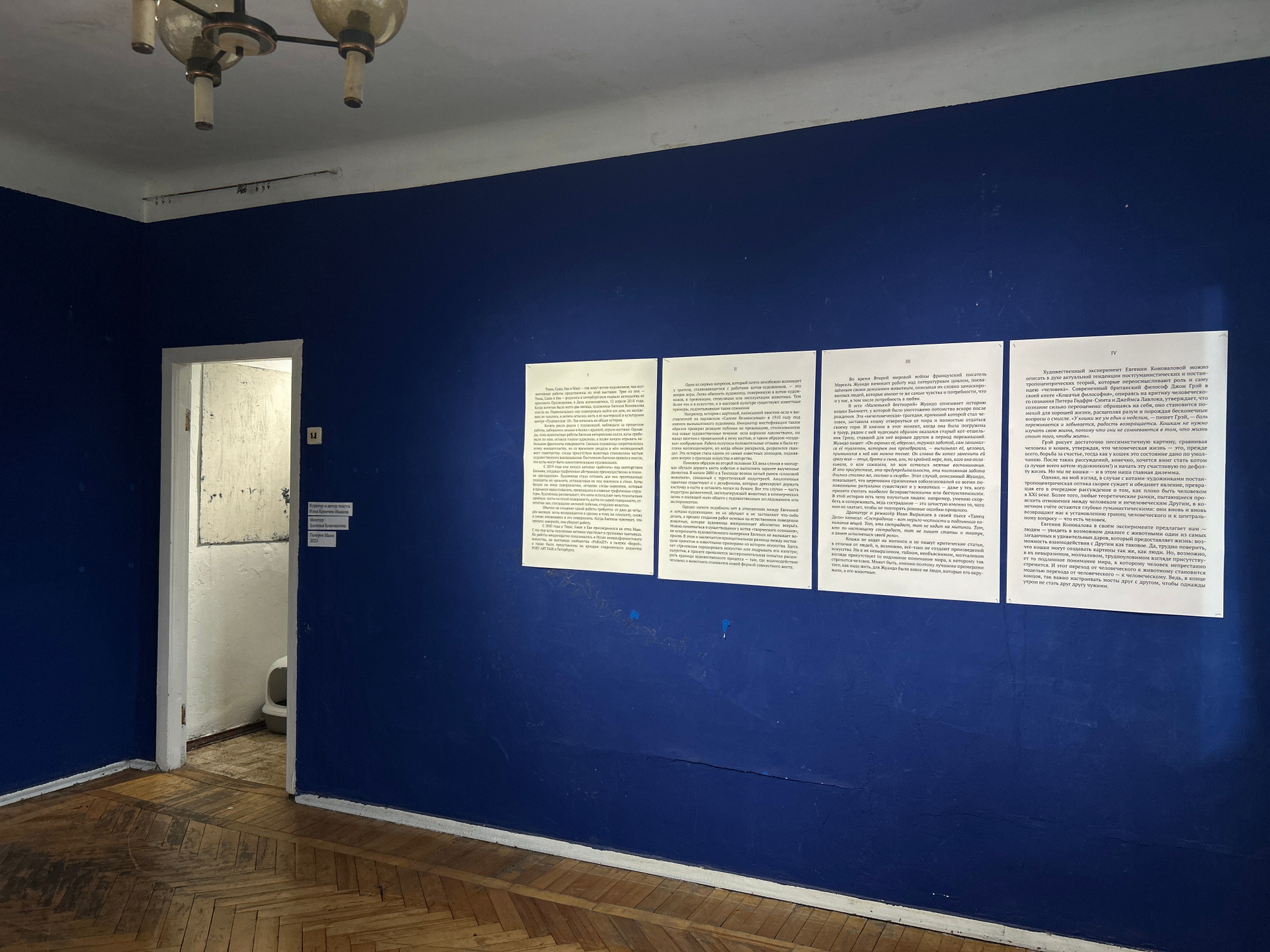 Тиша, Саша, Ева и Макс — так зовут котов-художников, чьи коллективные работы представлены на этой выставке. Трое из них — Тиша, Саша и Ева — родились в петербургском подвале неподалёку от проспекта Просвещения, в День космонавтики, 12 апреля 2018 года. Когда котятам было всего два месяца, художница Евгения Коновалова спасла их. Первоначально она планировала найти им дом, но желающих не нашлось, и котята остались жить в её мастерской в культурном центре «Пушкинская-10». Так началась их общая история.