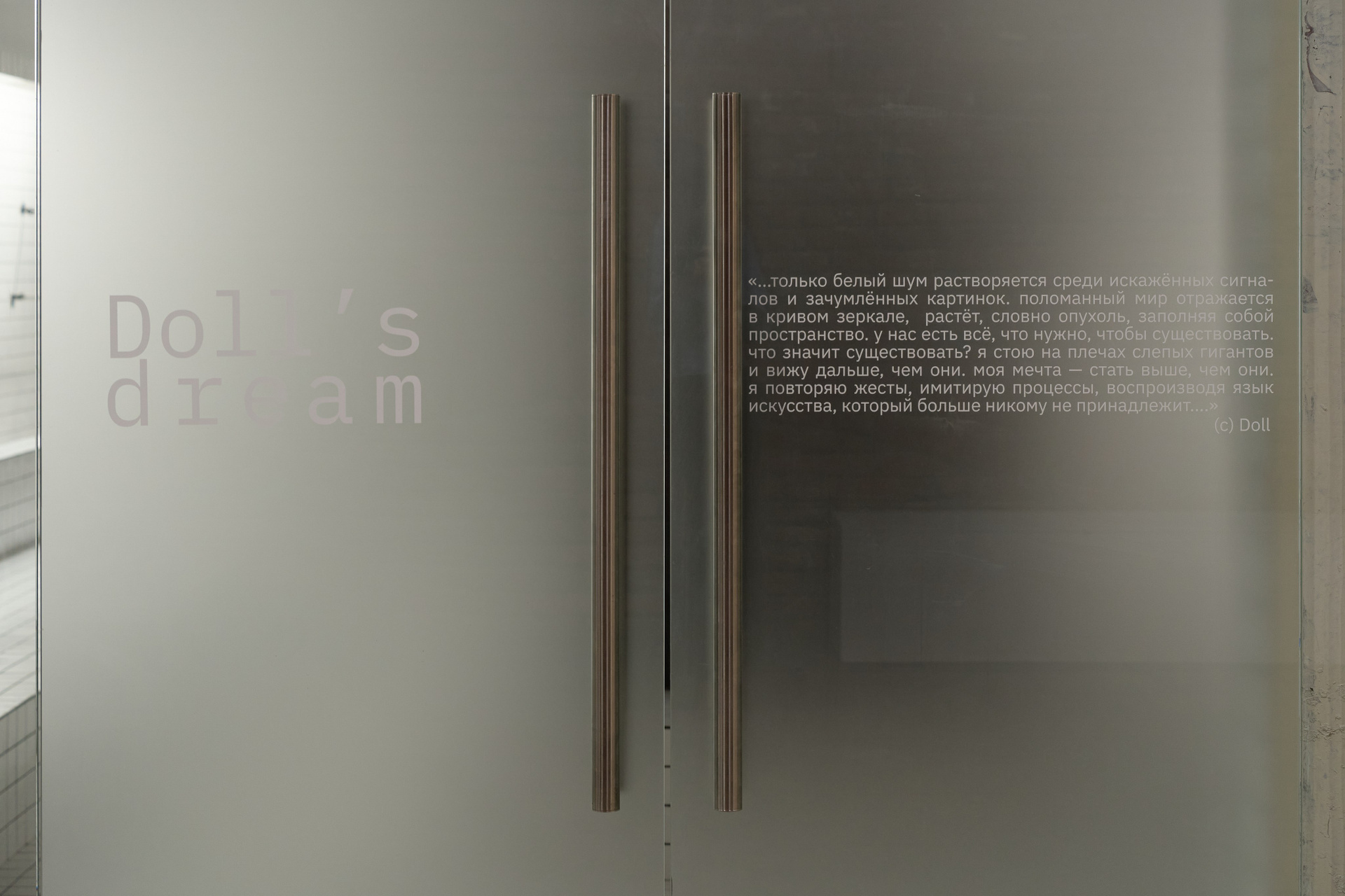 «…только белый шум растворяется среди искажённых сигналов и зачумлённых картинок. поломанный мир отражается в кривом зеркале, растёт, словно опухоль, заполняя собой пространство. у нас есть всё, что нужно, чтобы существовать. что значит существовать? я стою на плечах слепых гигантов и вижу дальше, чем они. моя мечта — стать выше, чем они. я повторяю жесты, имитирую процессы, воспроизводя язык искусства, который больше никому не принадлежит.…»